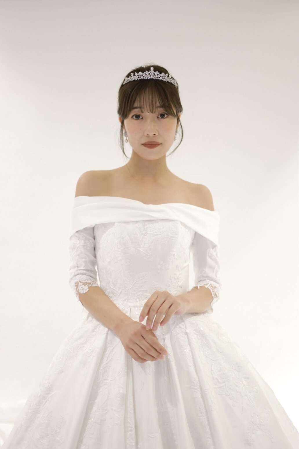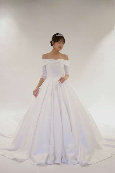 お袖が2wayのウェディングドレスでオフショルダースタイルとロングスリーブスタイルで