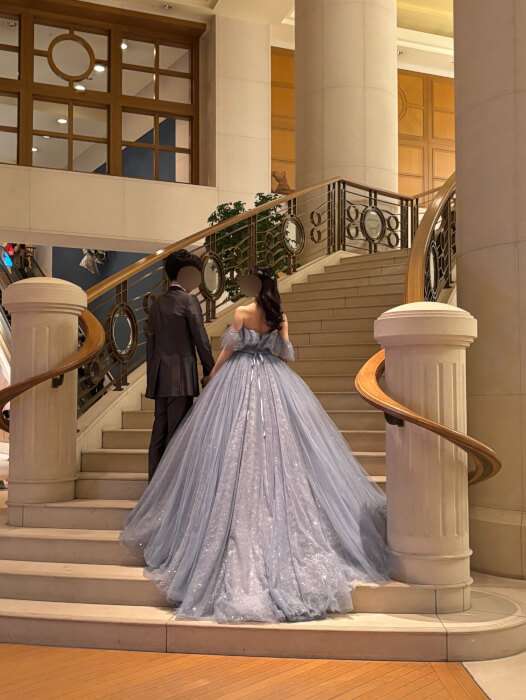ロングトレーンのドレスと階段ショットの組み合わせはすごく豪華ですし、会場様も明るいのでよりドレスのキラキラが伝わってきます!🌟