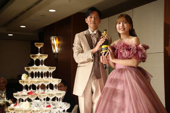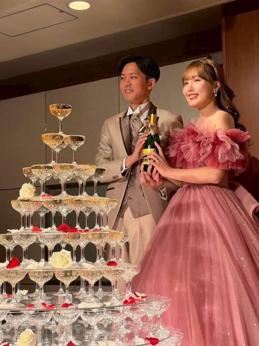 テーブルのお花もホワイトと赤の薔薇の組み合わせはメリハリが合って大人っぽくてドレスに合うお色味ですね!シャンパンタワーも豪華ですごいです!!