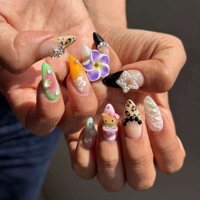 立体の紫のお花がと緑ピンクのネイルが個人的にいちばん好きです![]()