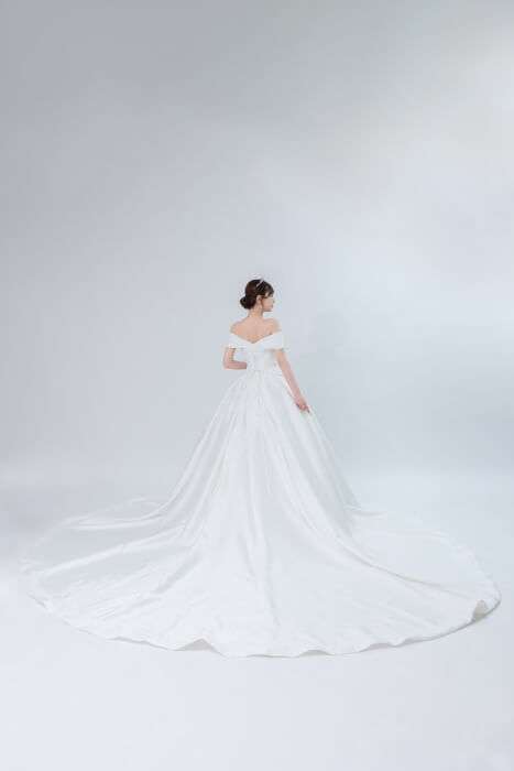 こちらのドレスは全身がサテンの生地でオフショルダーにはワンポイントタックがあり、