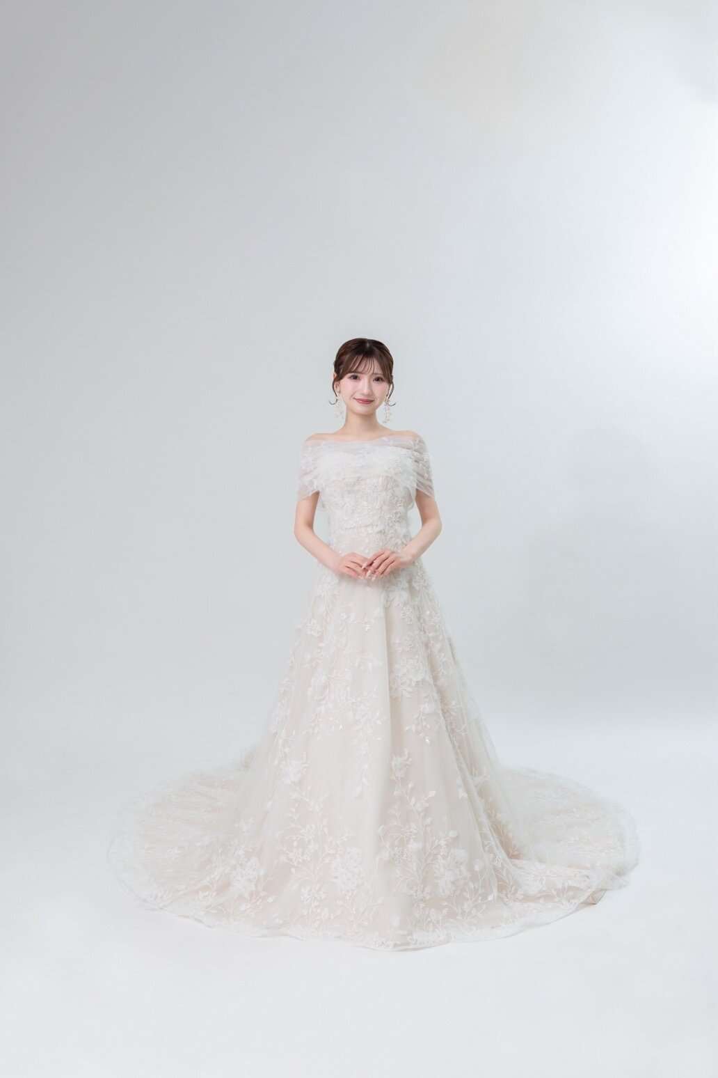 透け感ある刺繡であしらわれるオフショルダーがお顔周りも華やかに魅せてくれ可愛らしい雰囲気に💗