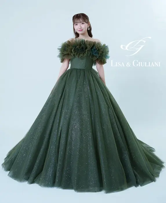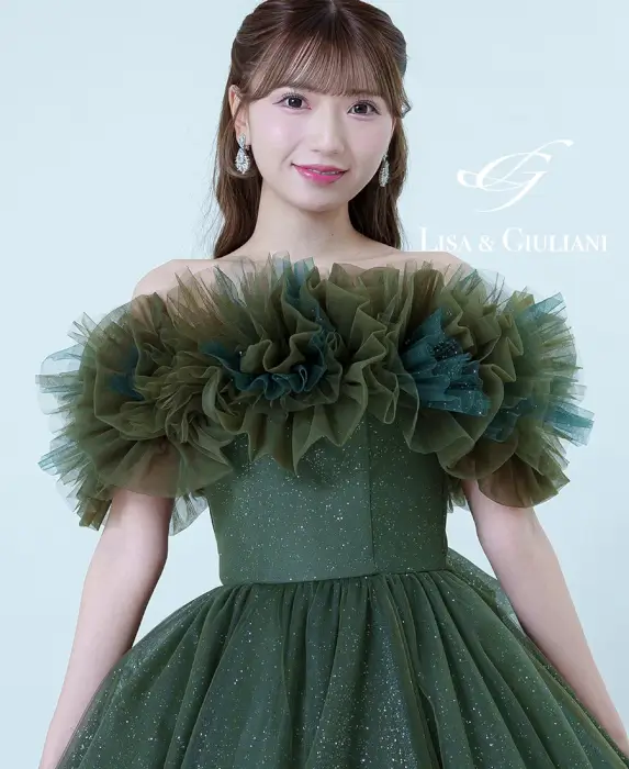お袖のチュールもグリーン2種とラメチュールがほどこされていて顔周りも華やかです💐🤍