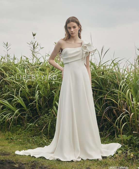 お袖は華やかめなパフスリーブと大人な印象のワンショルダー2種類のお袖が付く素敵な1着💓