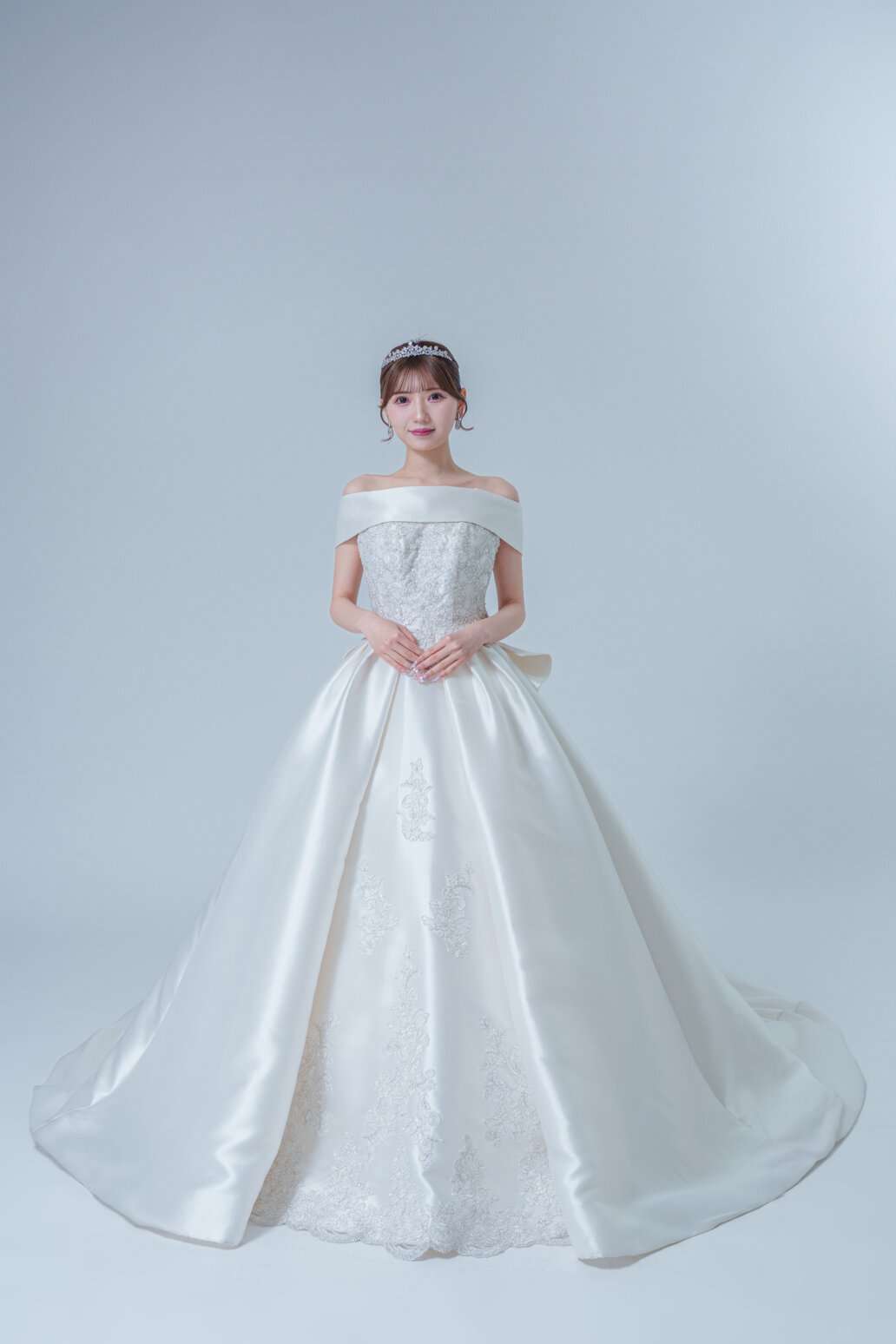 腰元には大きなリボンとトレーンを取り付けることができ、リボンはサテン生地とレースが2層になっているのもお洒落なポイントです!