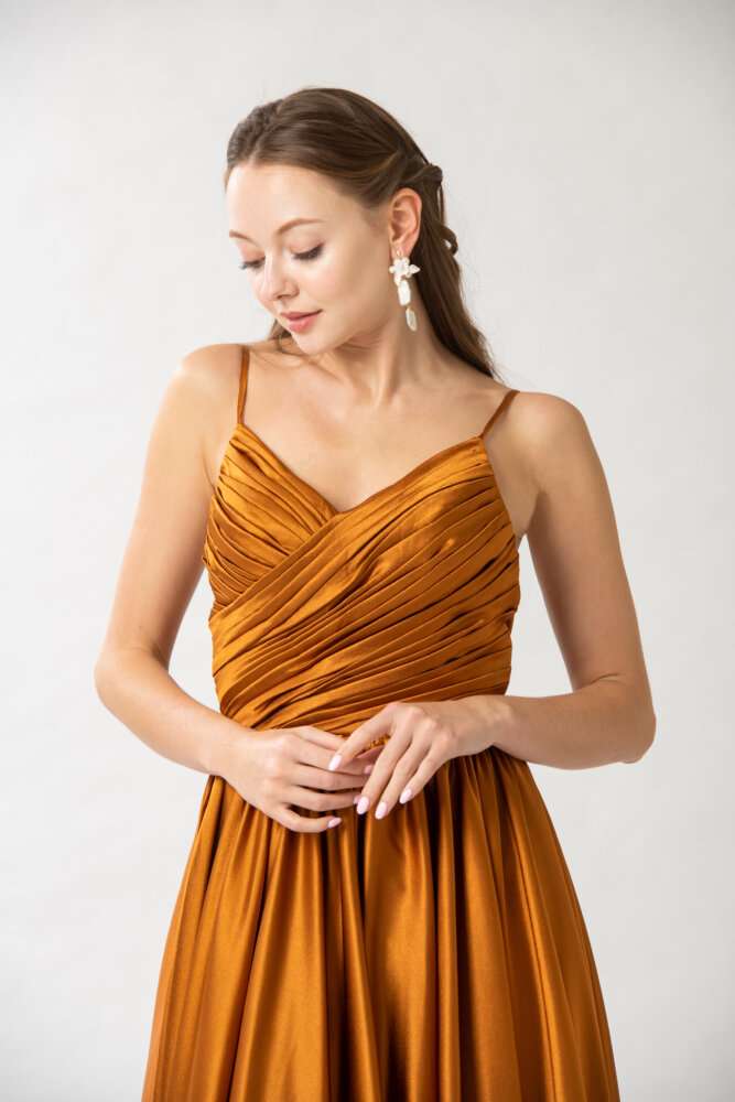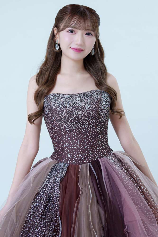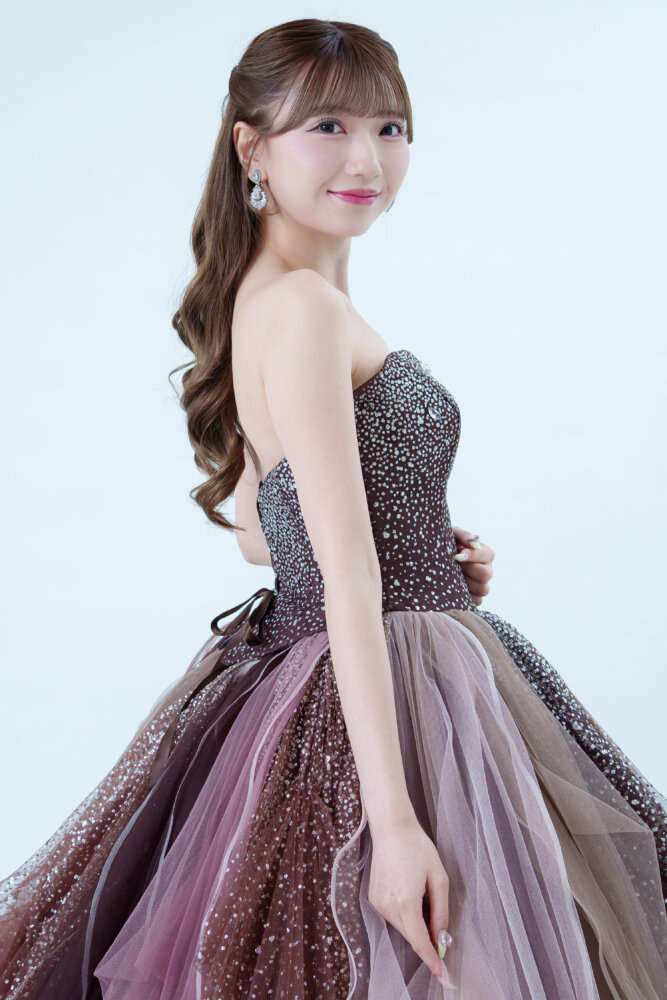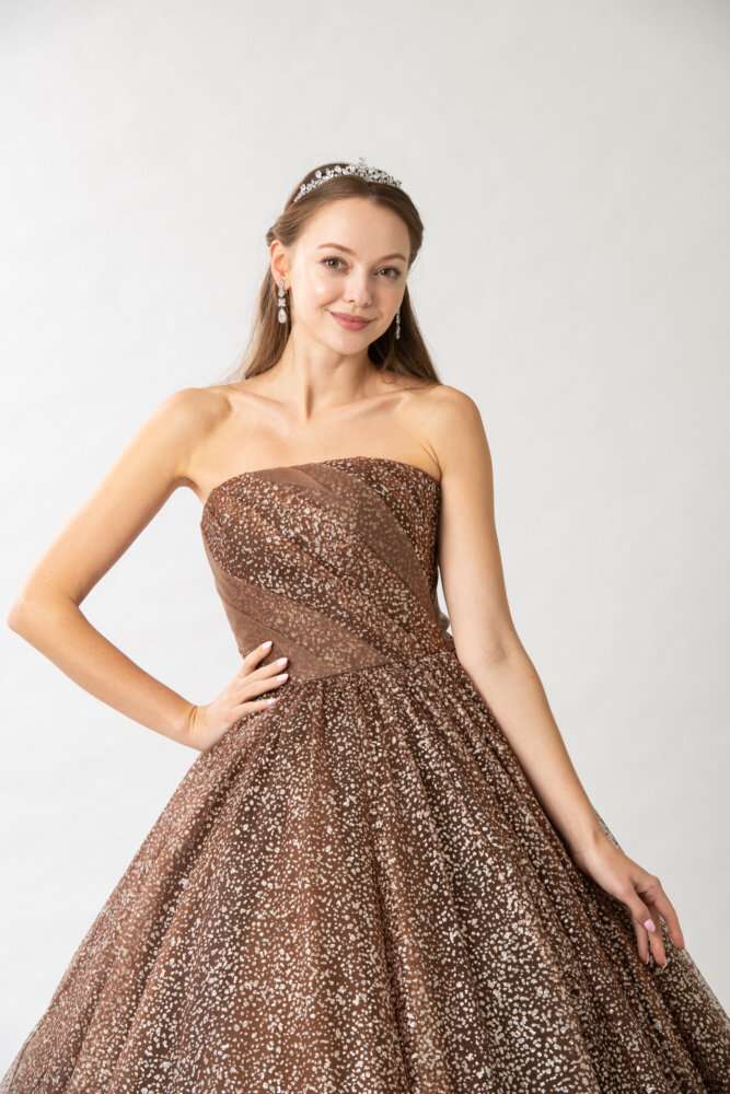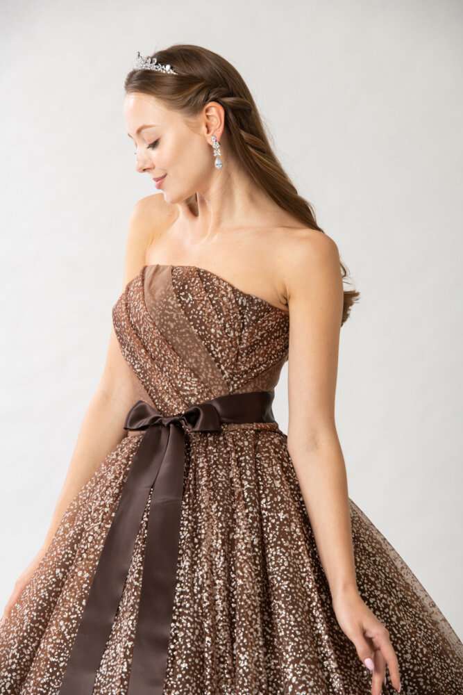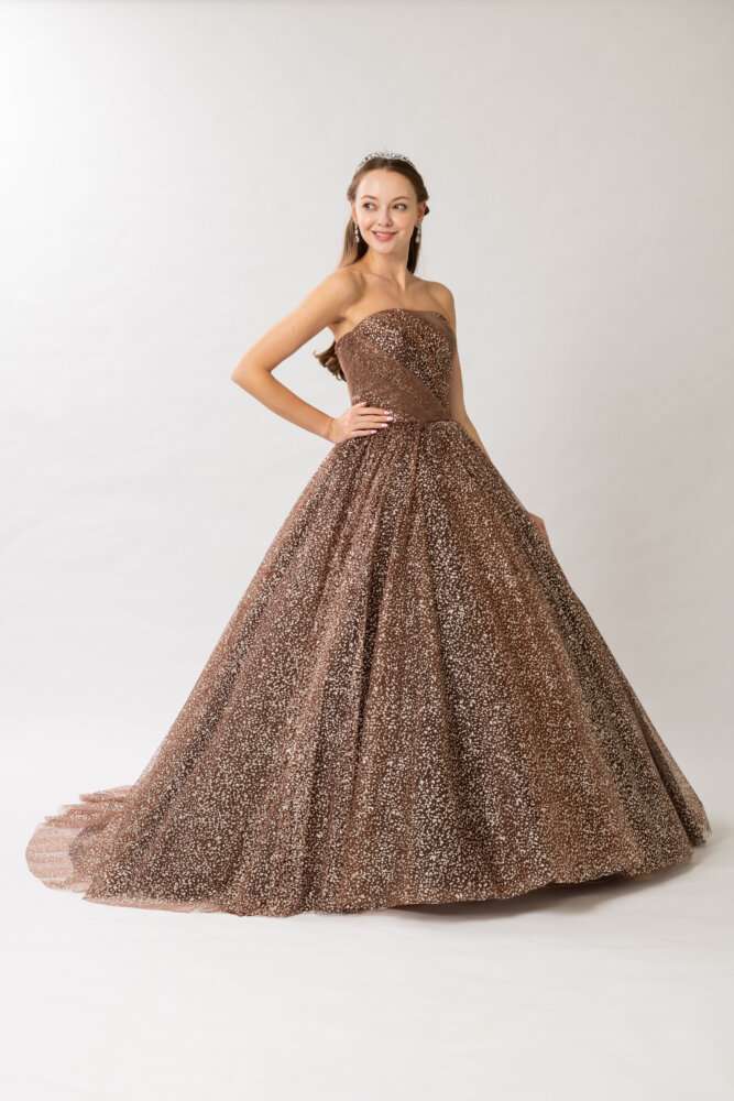 ビスチェはブラウン生地に大粒グリッタ―で顔回りがはっきり見えるデザイン(^^)/