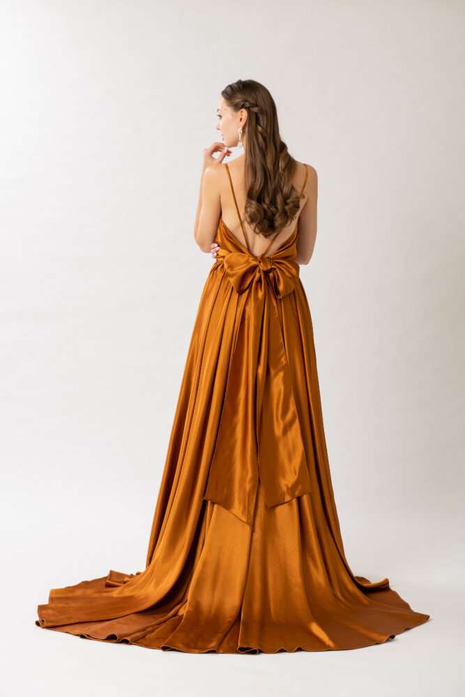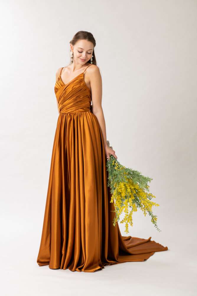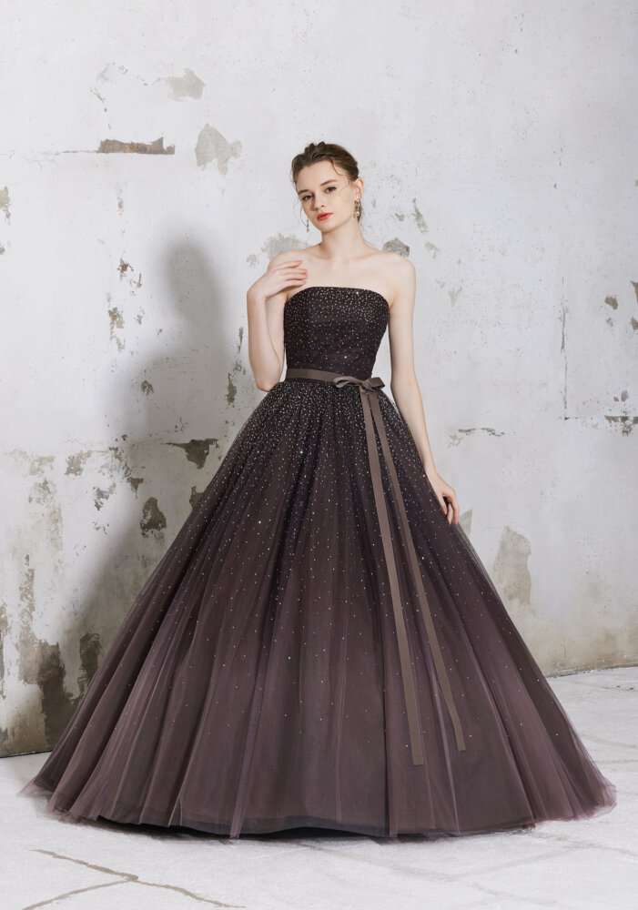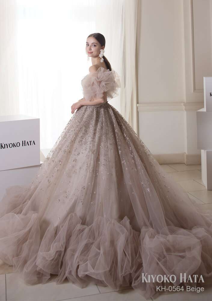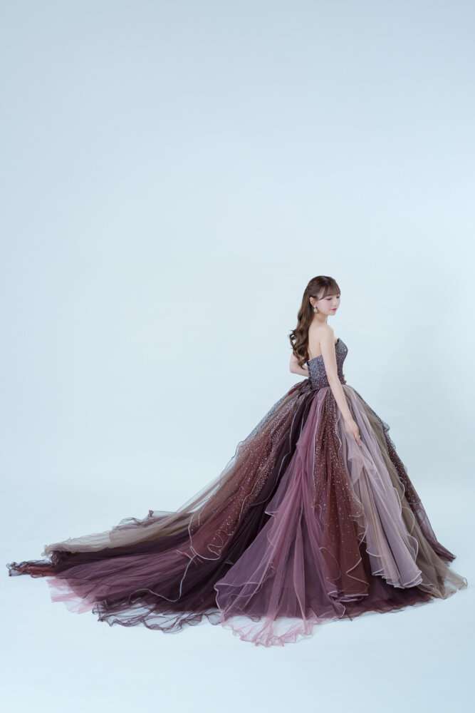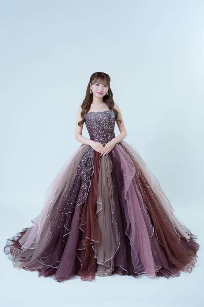 スカート部分が特徴的なドレスでベージュ・ブラウンのそれぞれのお色味が使われている存在感のあるカラードレスです!