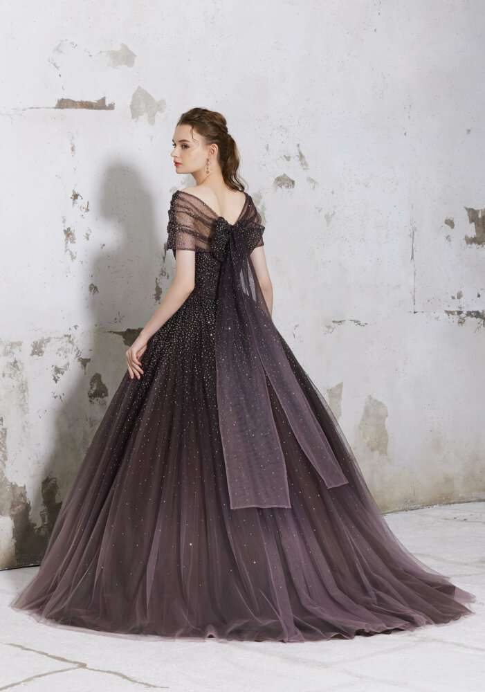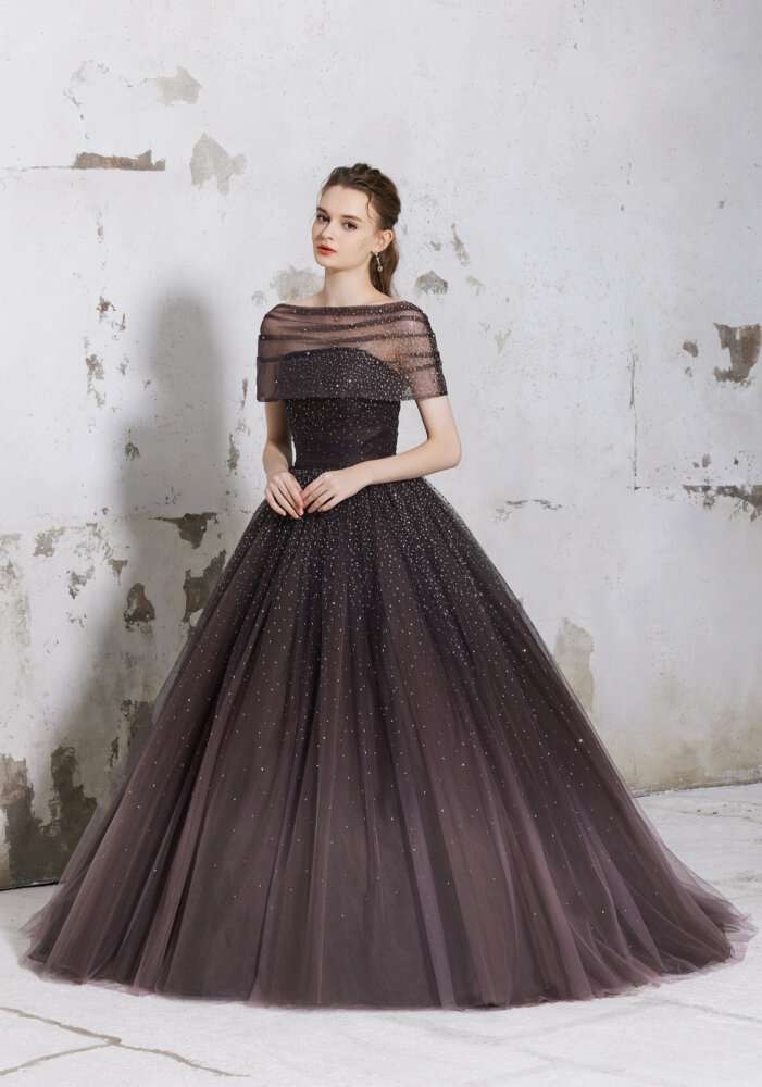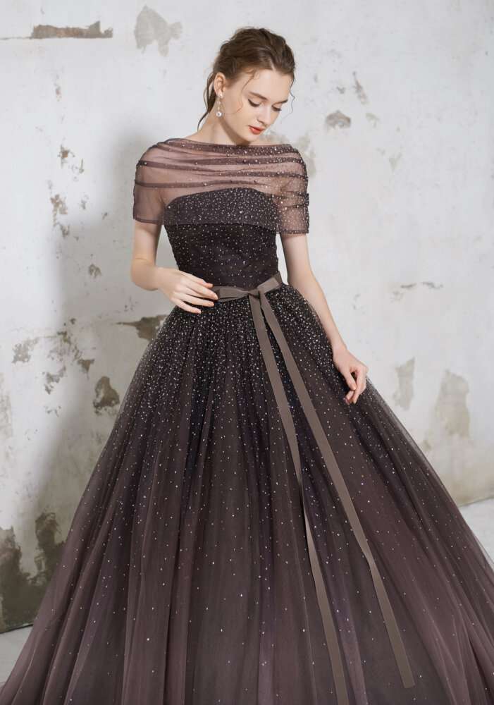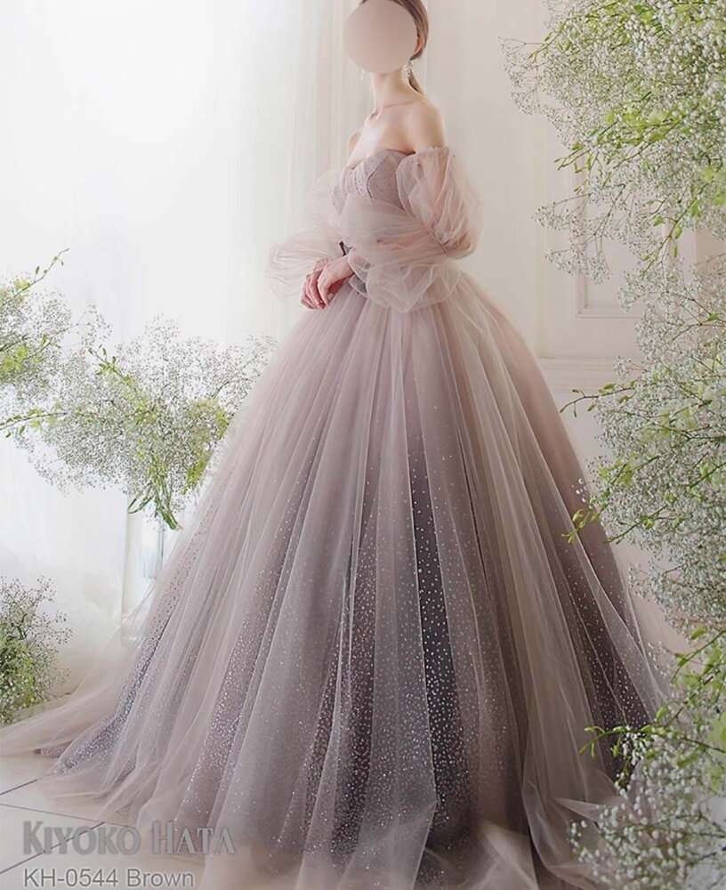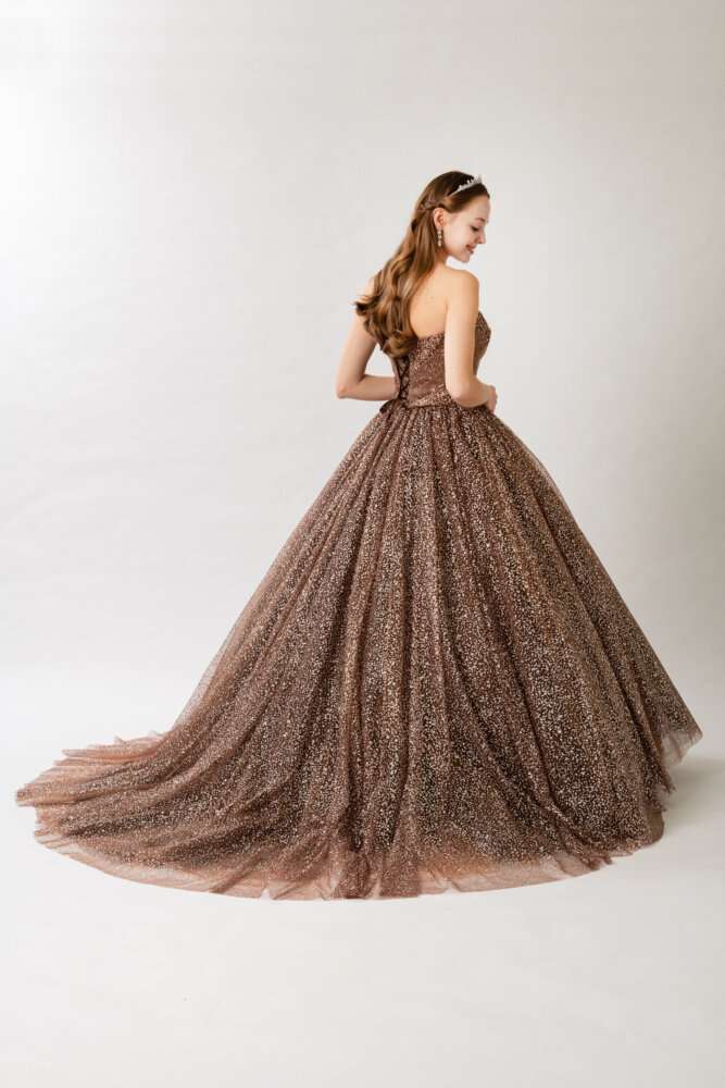 チュール生地の内側に大粒のグリッタ―が施されていてお上品なキラキラ感とスカート内側のブラウンのグラデーションのお色味もナチュラルな印象に見せてくれます(^^)/