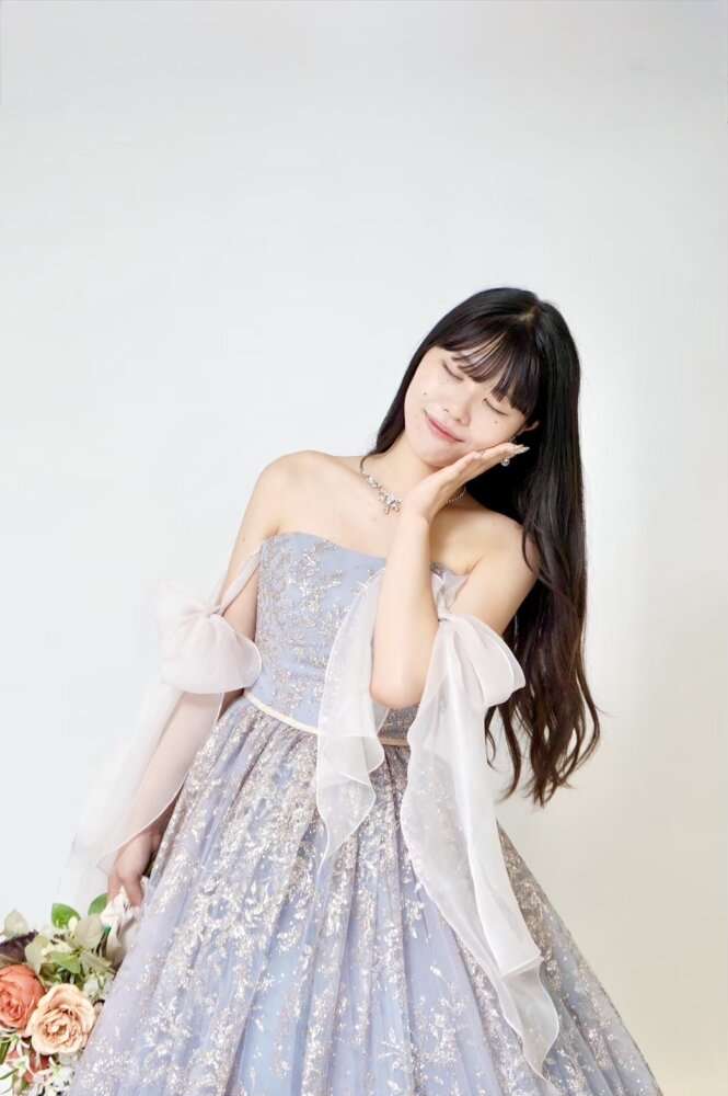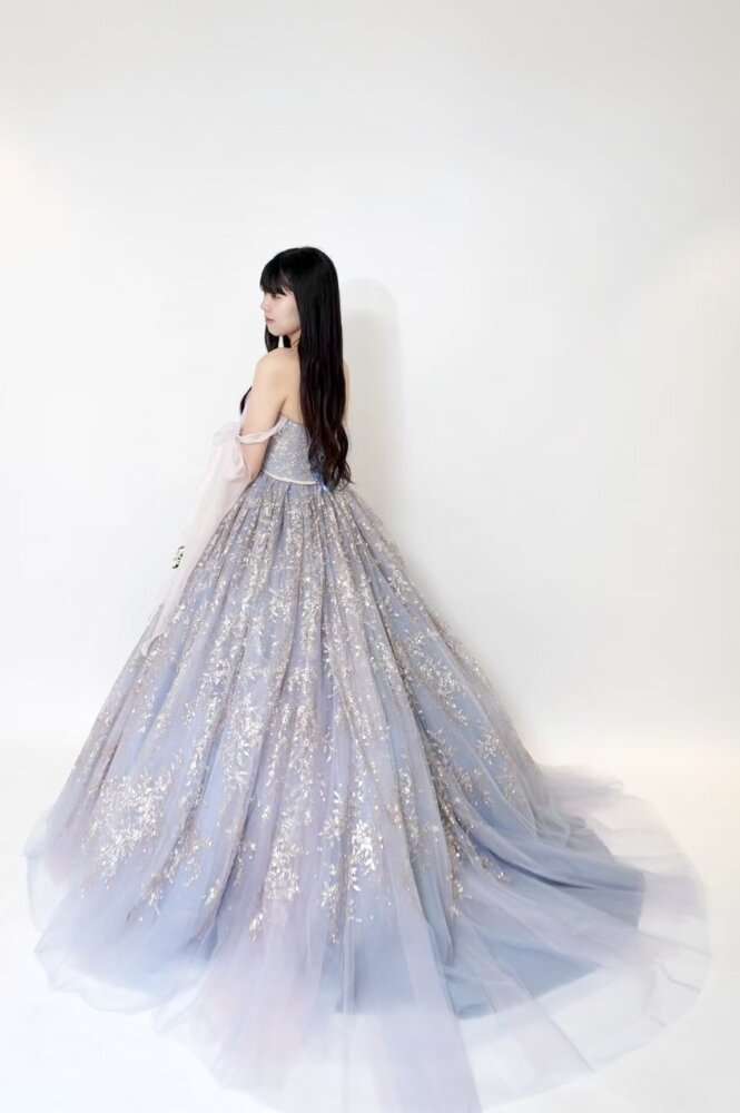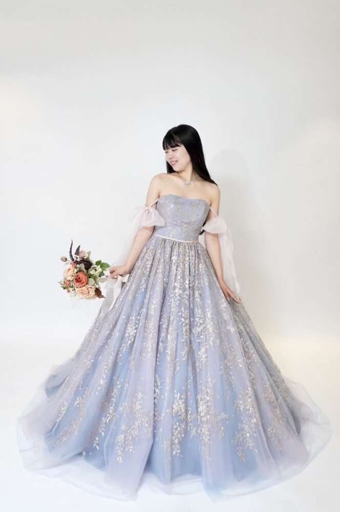 シンデレラのような淡い水色カラーで大粒のグリッタ―が施されている豪華な1着です(^O^)/
