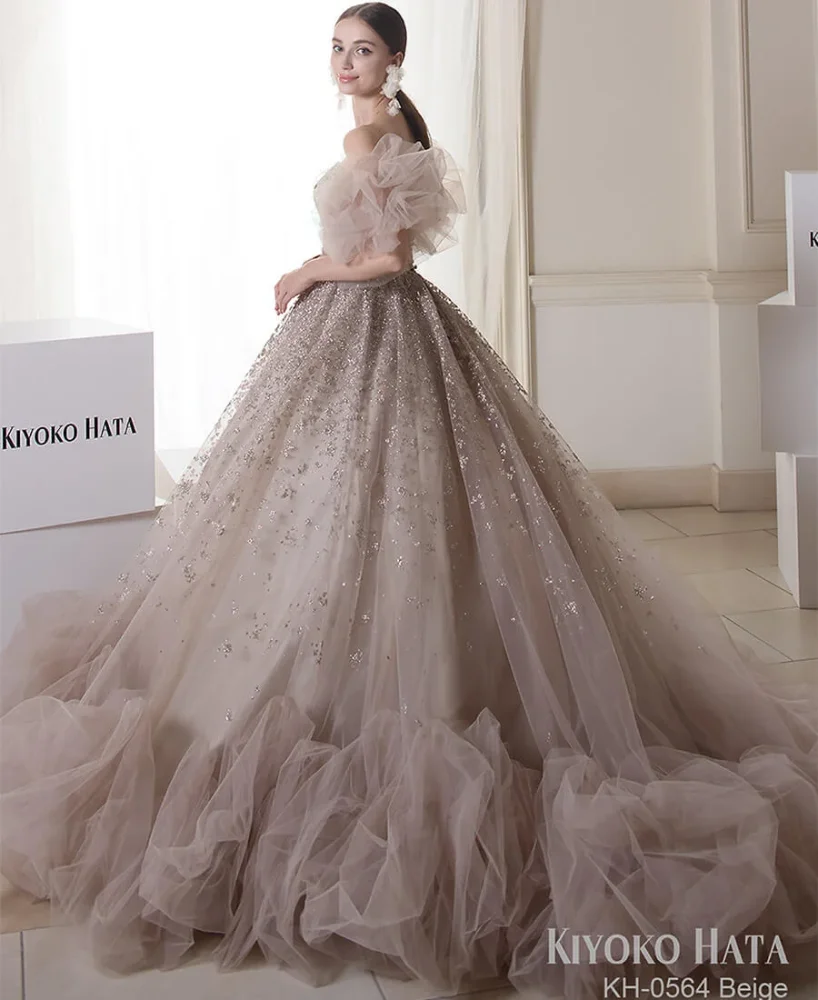 胸元にはレースとビジューが施され、ベージュの生地には繊細なラメが輝く華やかなデザイン![]()