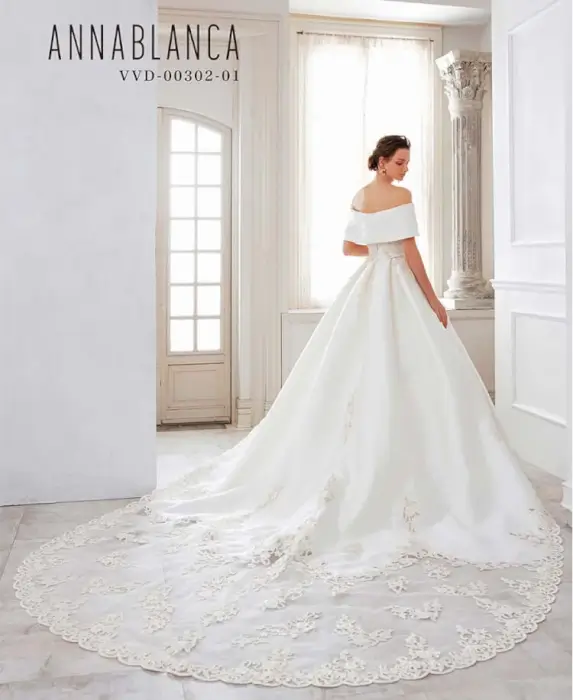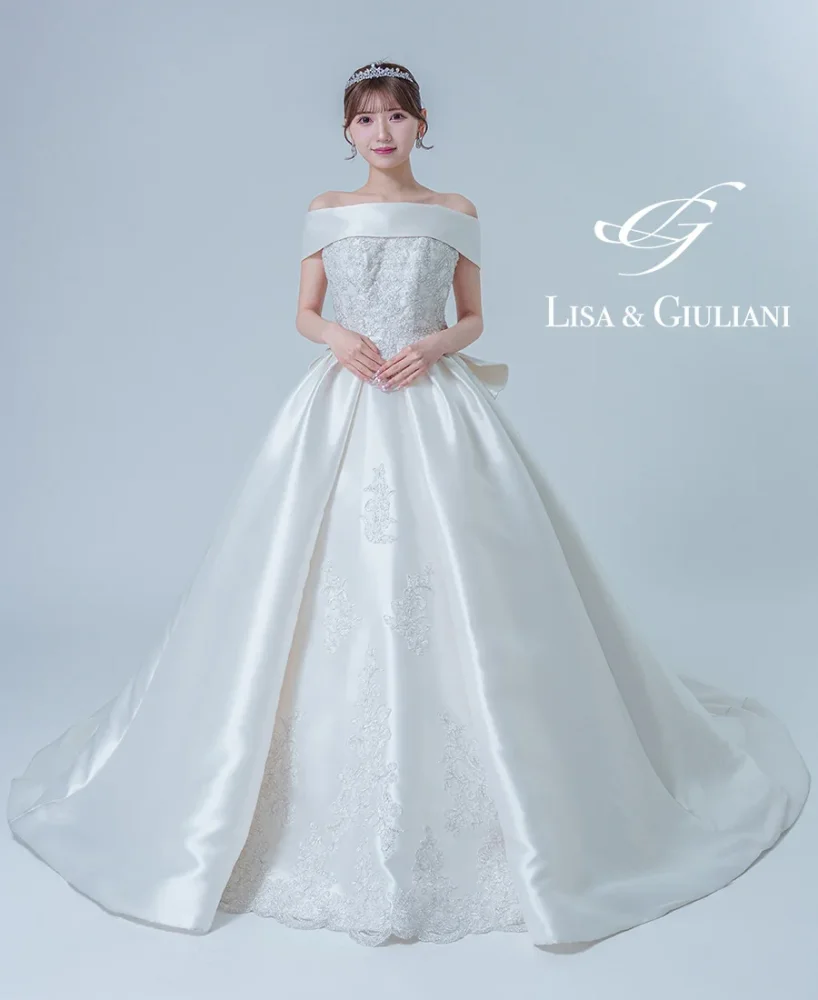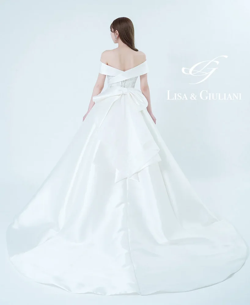 大柄刺繍と大粒パールが施されたトレーンは、広い会場にも映えるデザインです![]()