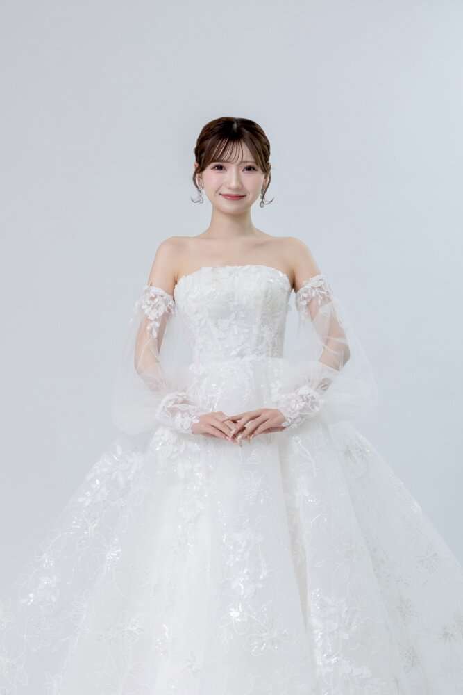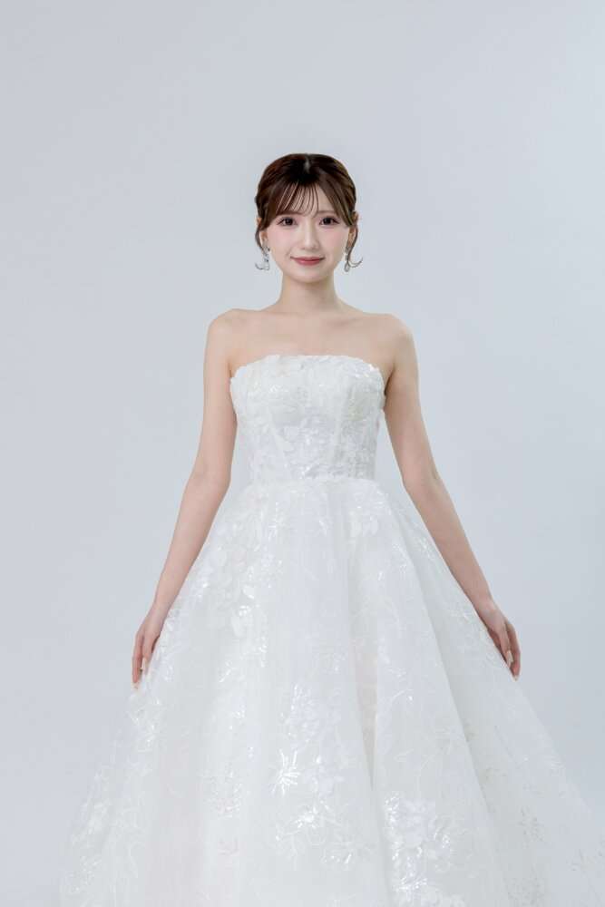 お胸元からスカート裾までデザインがしっかりと施されていて、スパンコールもつくことでよりキラキラとしていて明るい印象になります!どの角度からみても華やかで主役感抜群なのも嬉しいポイント🌟