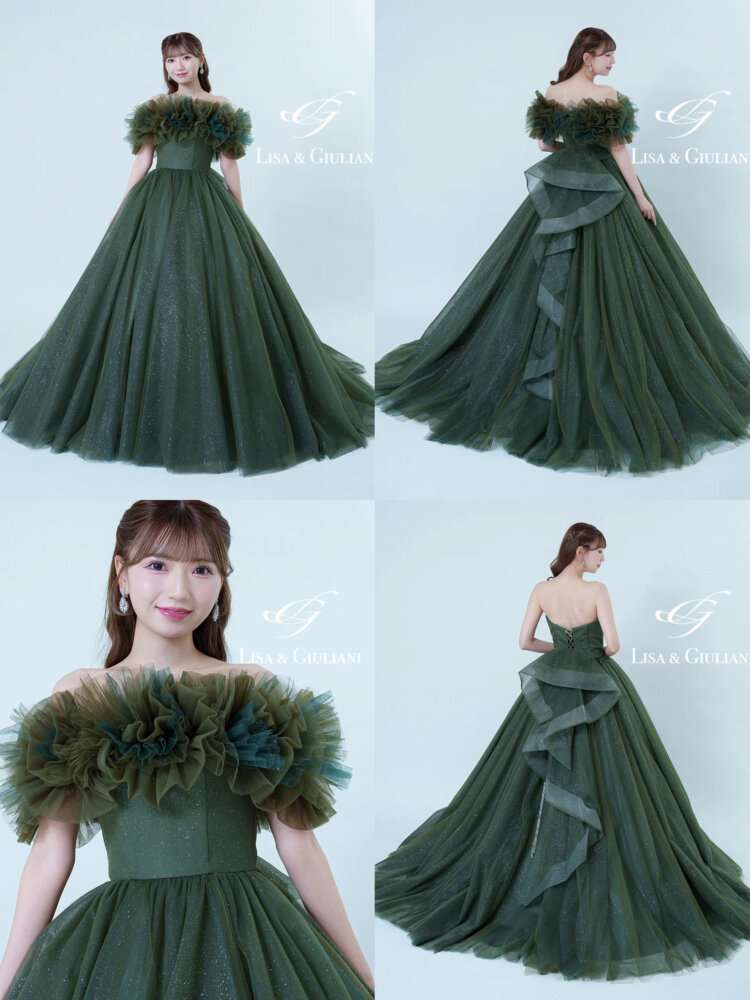 濃いカーキとグリーンが重なった大人可愛いドレス🍀