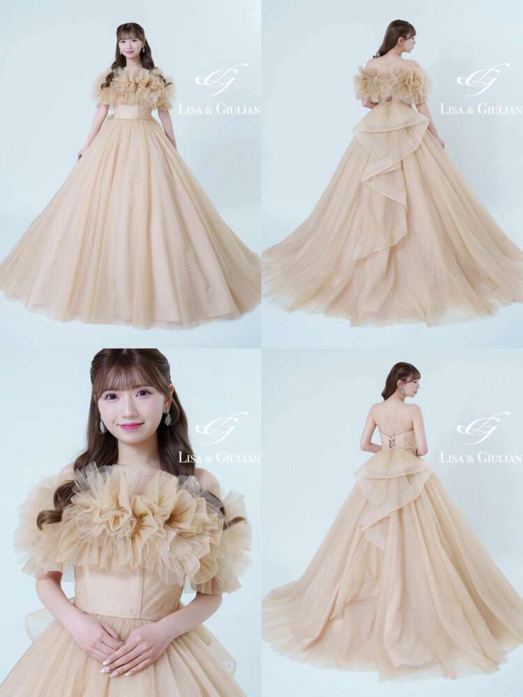 淡いシャンパンカラーが可愛らしいドレスです✨