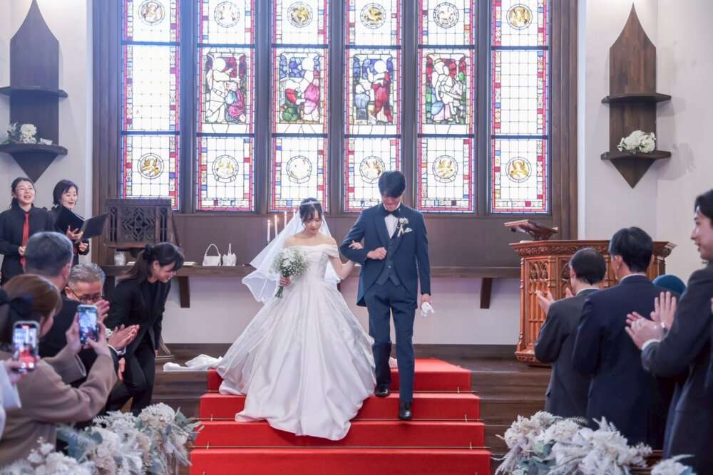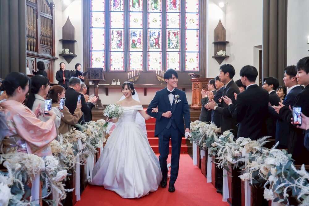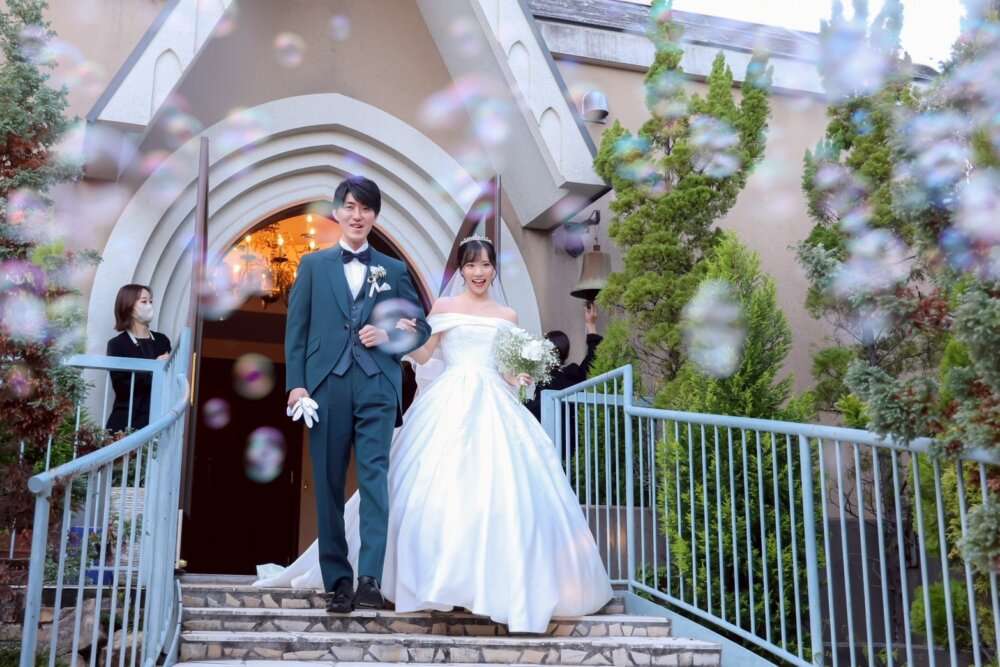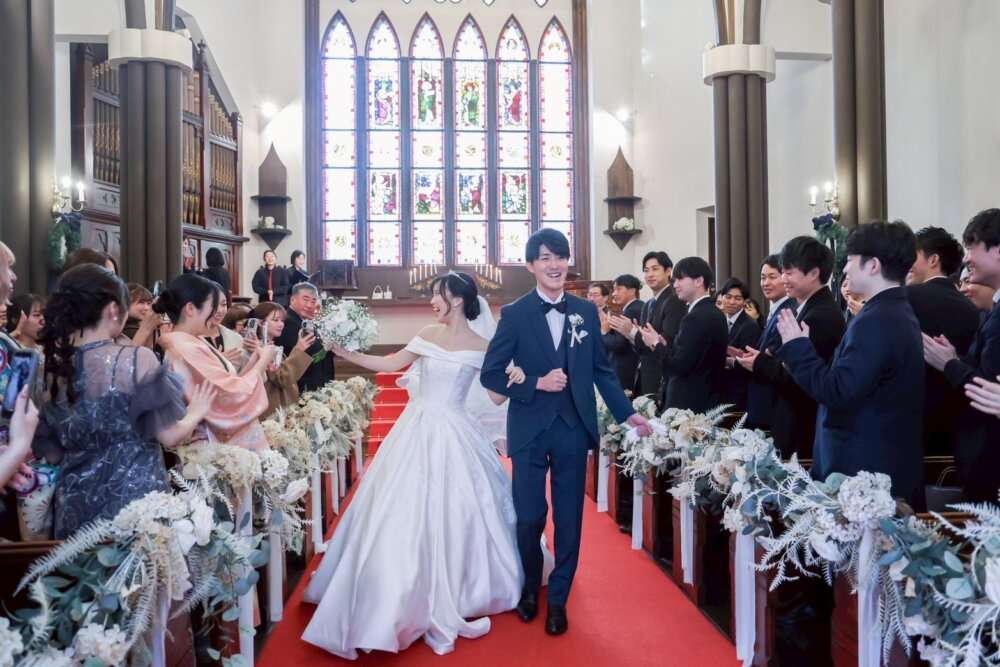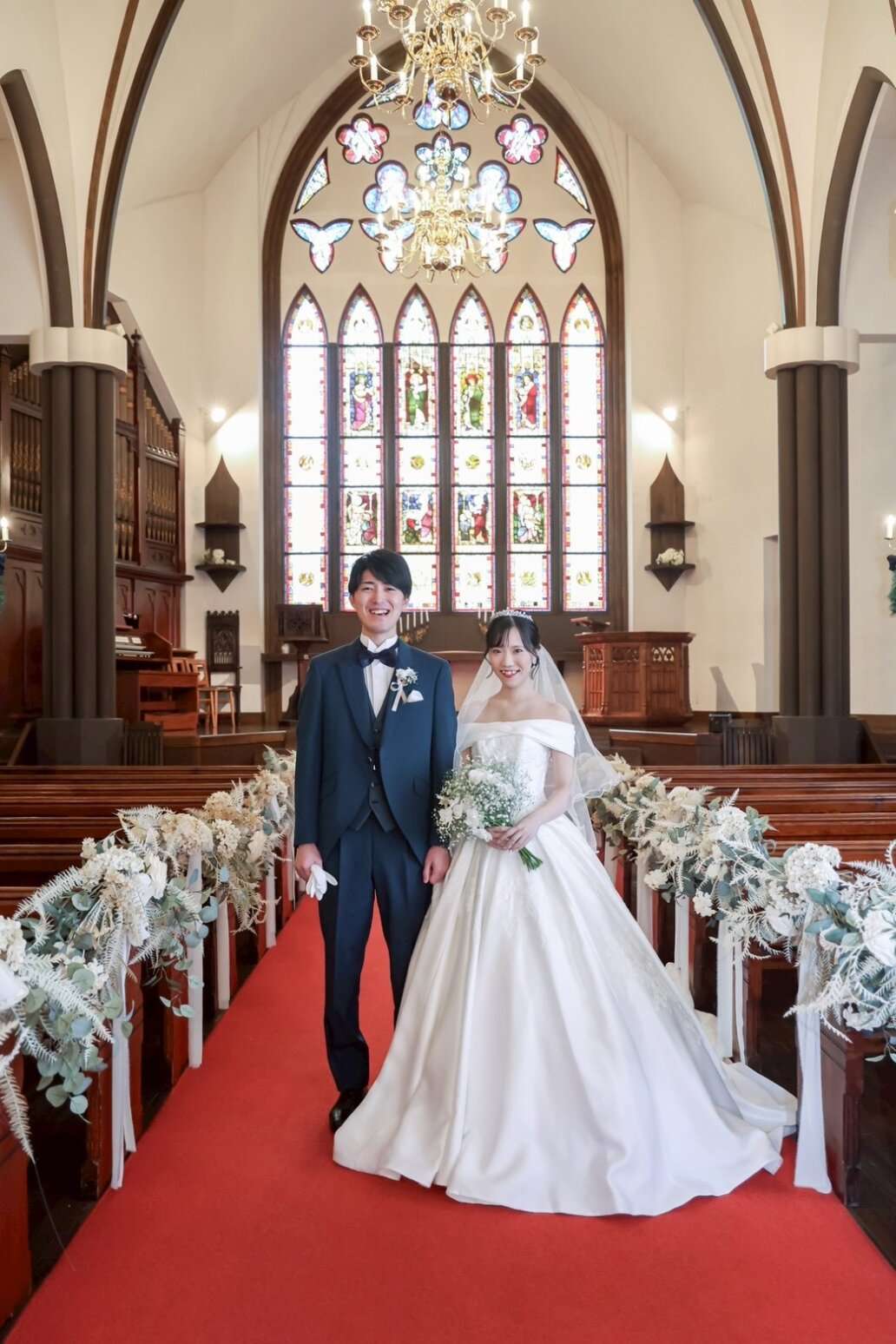 サテンドレスとグリーンタキシードに大聖堂のチャペルは相性抜群のコーディネートになってます✨