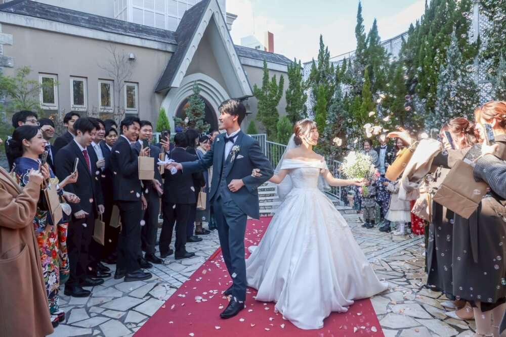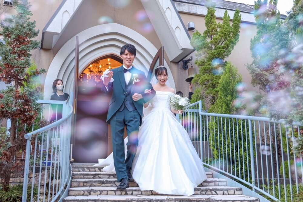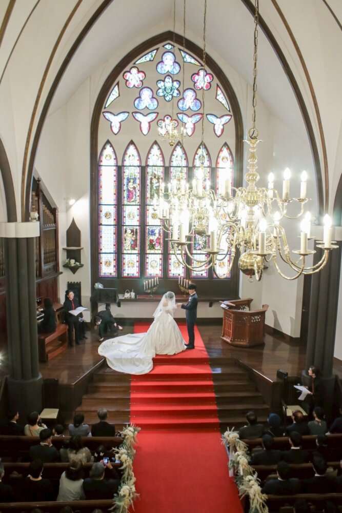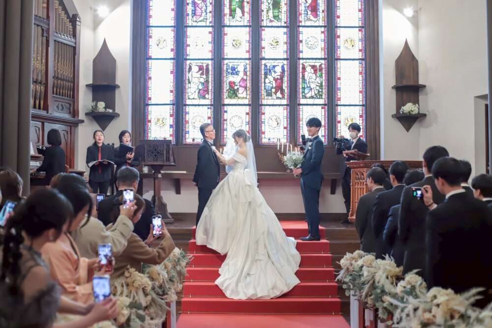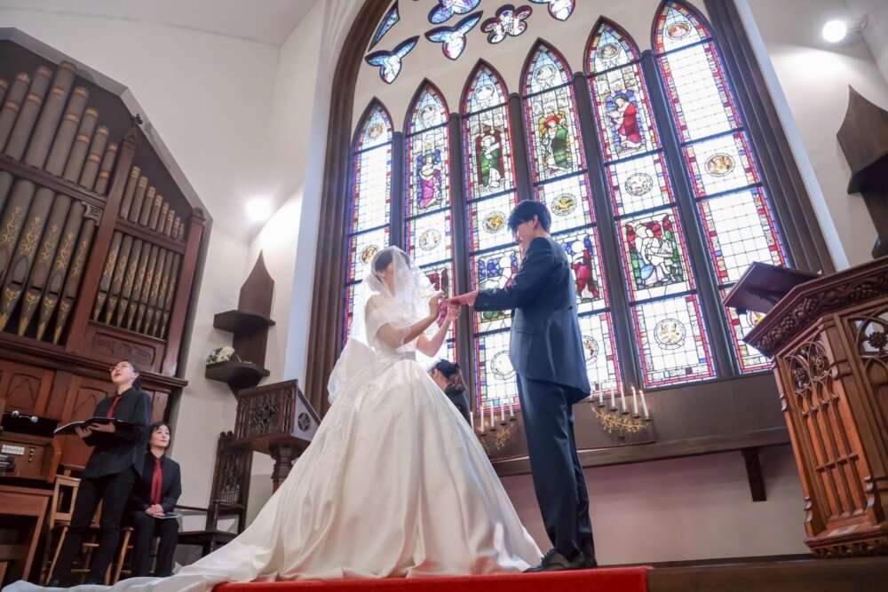 サテンドレスとグリーンタキシードに大聖堂のチャペルは相性抜群のコーディネートになってます✨