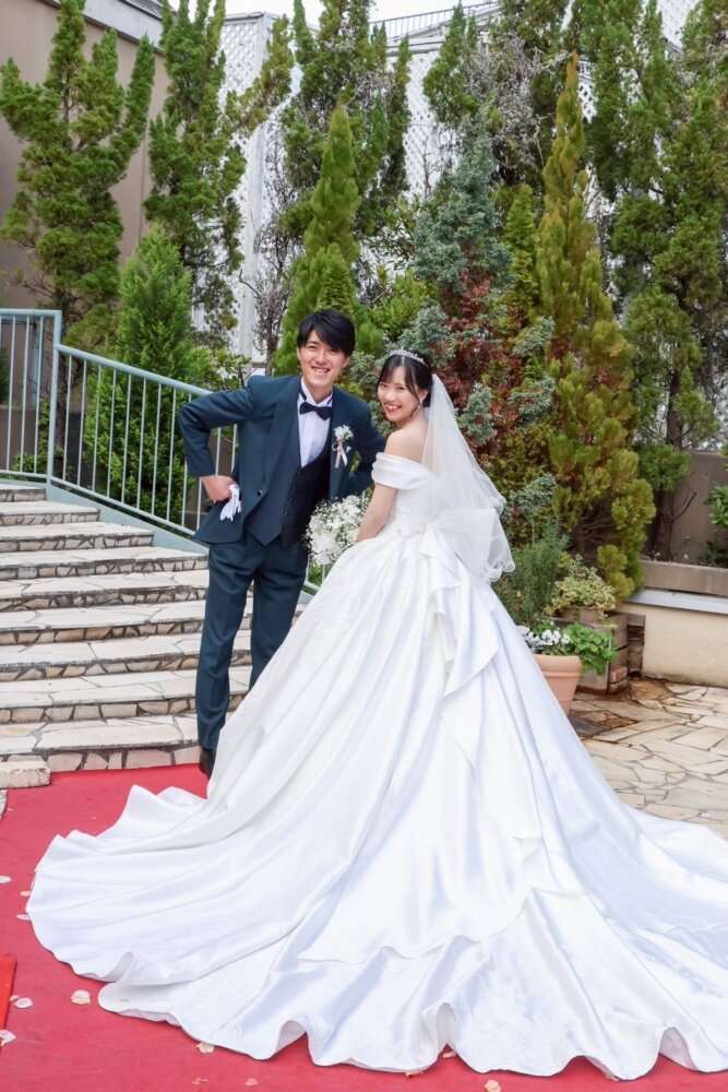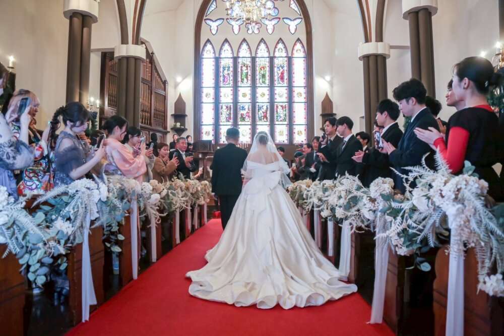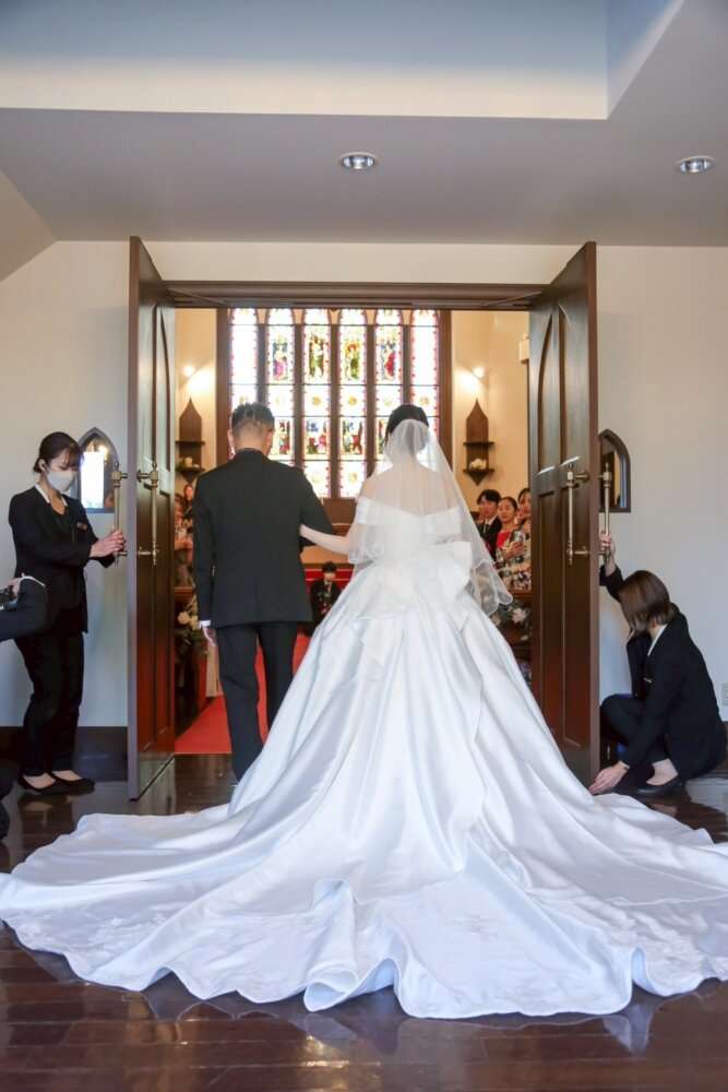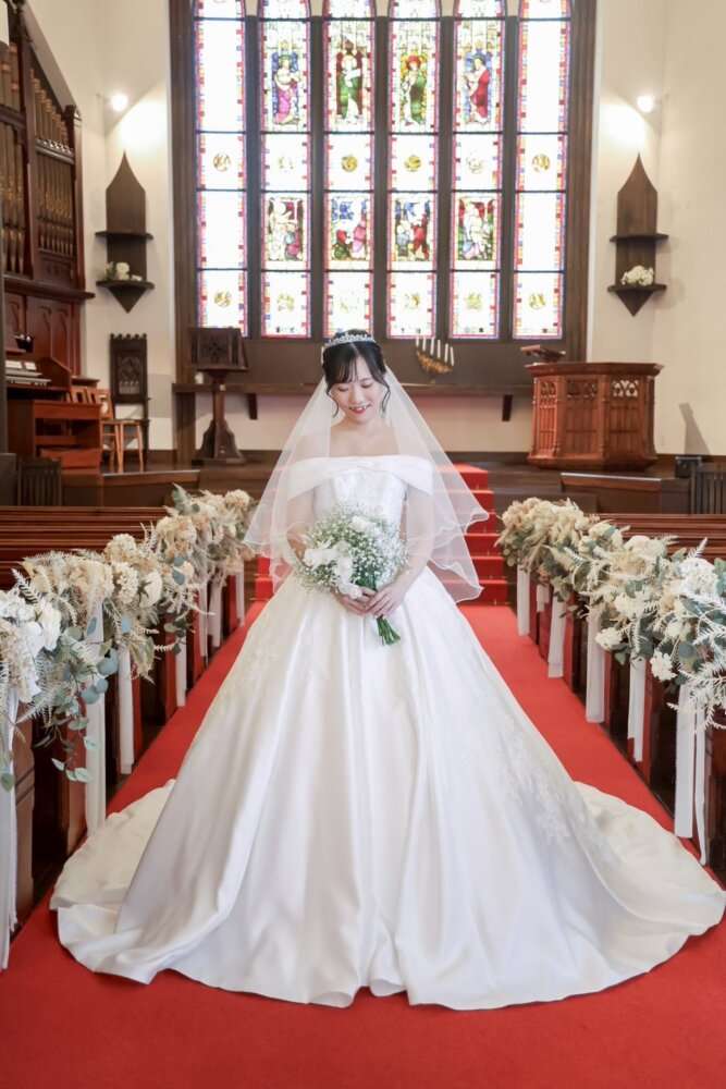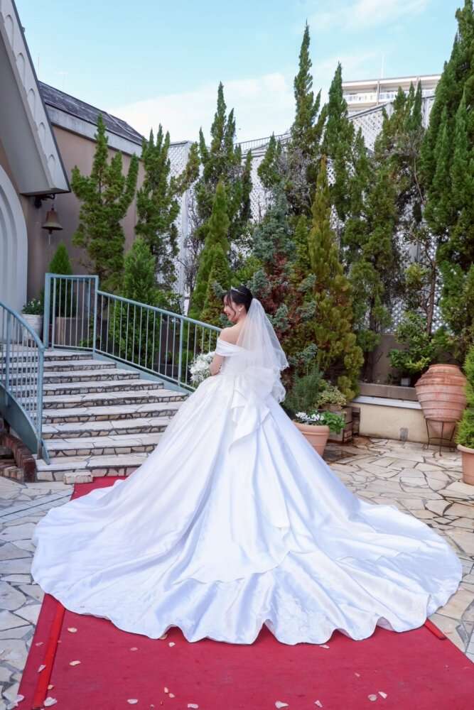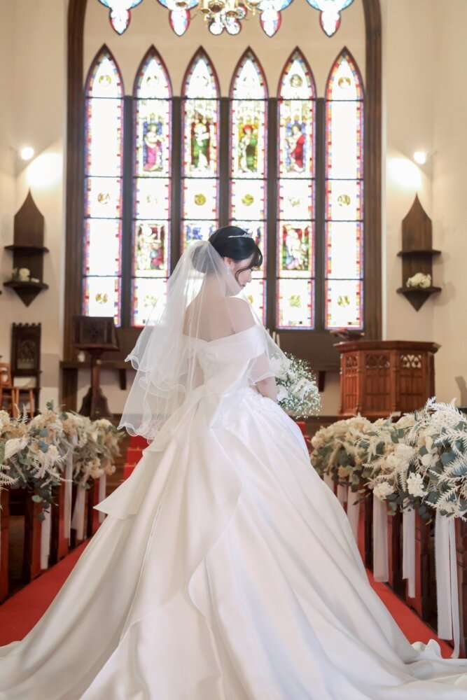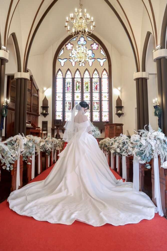 大聖堂にあうロングトレーンドレスでどの角度からみてもドレスのシルエットが美しく、華やかで存在感のあるデザインです!お胸元からロングトレーンまでお花の刺繍が施されていてお上品です!🌷
