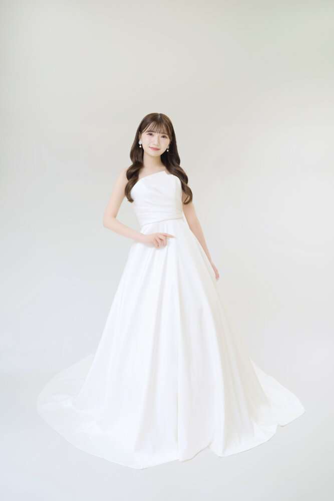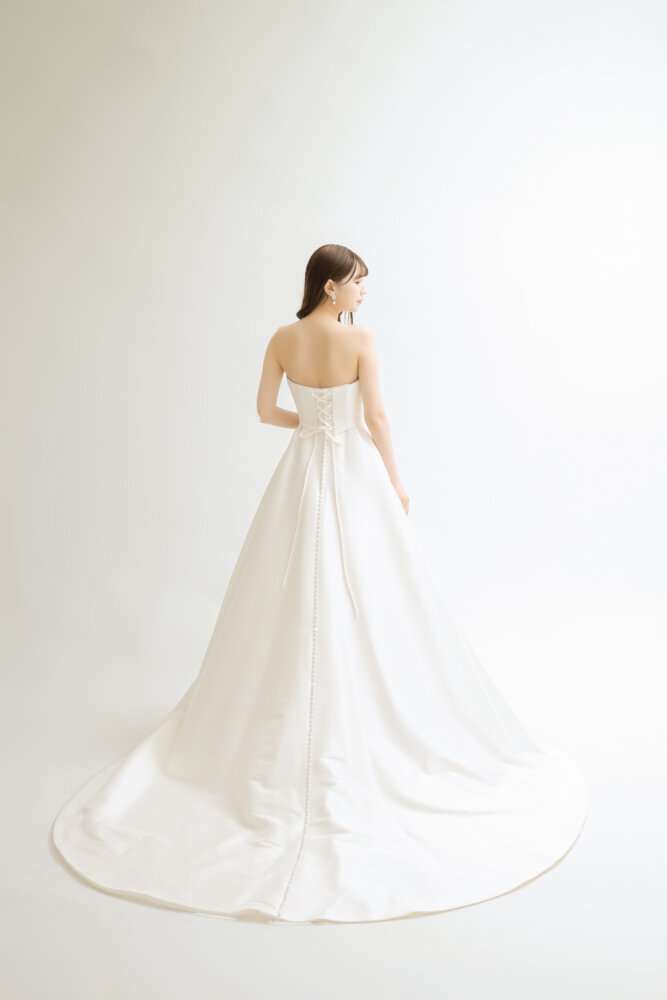 Aラインのシルエットはフィット&フレアのデザインなので、ウエストからスカートの広がりがすらっとして見え美しい1着です🌟胸元ビスチェもワンポイントデザインがありデコルテ周りはスッキリ見えます(^^)/